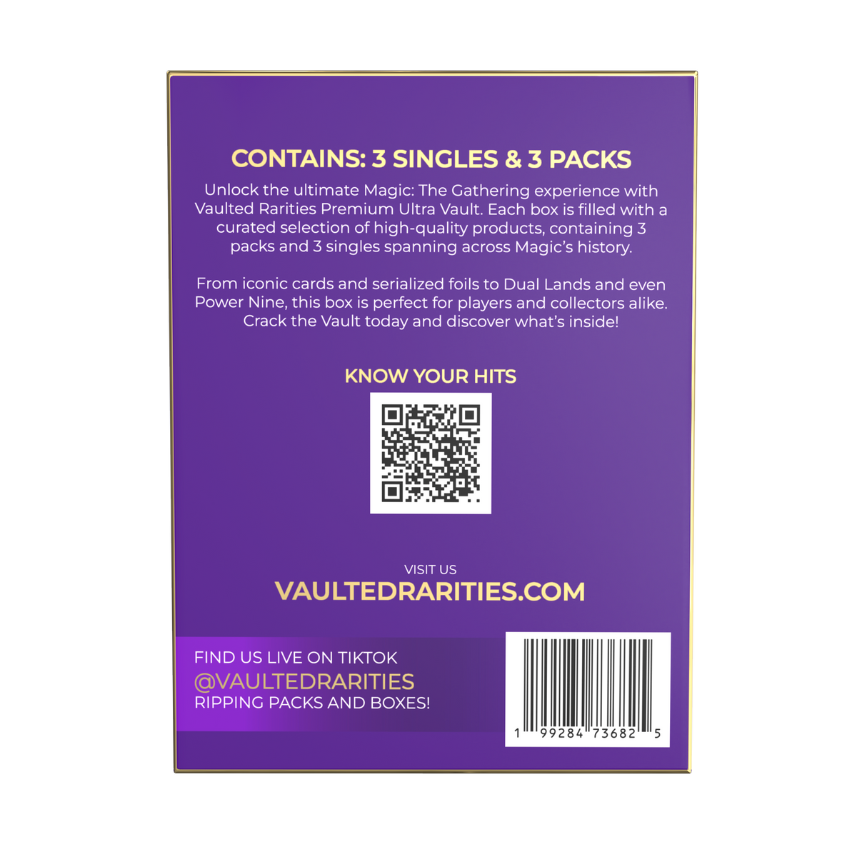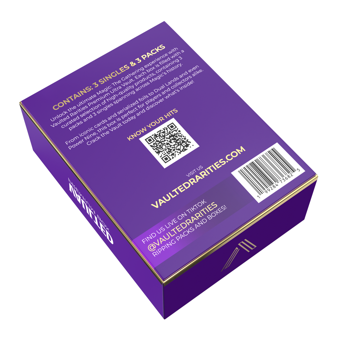 Each Vaulted Rarities Ultra Vault contains a tightly curated mix of 3 premium singles and 3 sealed Magic: The Gathering booster packs drawn from over 30 years of Magic history. Singles can be any rarity or card type, including foils, promos, format staples, and classic chase cards, while packs may include Play, Draft, Set, or Collector boosters from both modern and select older sets. Every item is chosen for excitement, collectibility, and long-term value, professionally sourced and securely packaged.